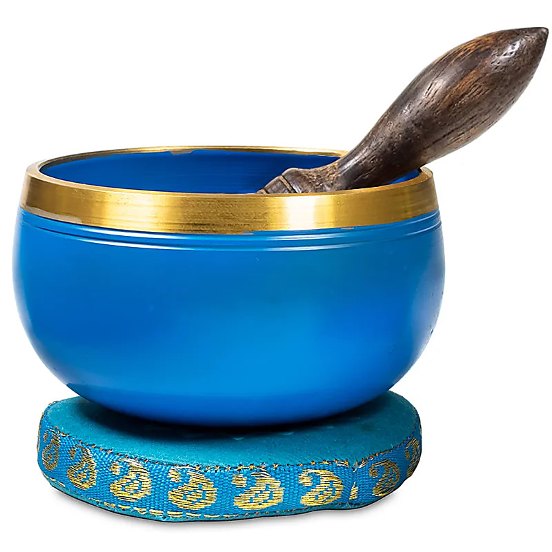 Bol chantant avec couleur et symbole de chakra. Fait d’un mélange de métal de laiton, de bronze et de fer, peinture sans plomb. Livraison avec bâtonnet, coussin et coffret cadeau en carton.